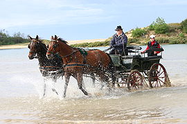 - en paire : les deux chevaux sont côte à côte, c'est-à-dire de chaque côté du timon (barre de bois ou de métal, solidaire du train avant qui assure la rotation de la voiture) ;