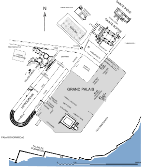 Les gradins étaient aménagés sur des passages voûtés faisant le tour de l'arène, excepté du côté des carceres. Au sommet des gradins courait un long portique. Un peu excentré vers le sud du côté oriental des gradins se trouvait le Kathisma (en grec), la loge monumentale de l'empereur, l'équivalent du pulvinar au Circus Maximus. Cette structure à deux niveaux comprenait, hormis la loge elle-même, une salle de réception, et communiquait directement avec le Grand palais localisé immédiatement à l'est (voir plan ci-contre), par un escalier en colimaçon (en grec, kochlias) dont l'accès était barré par deux portes de bronze.