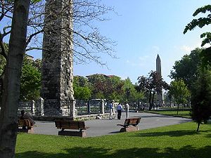 En 324, Constantin décide de transférer le siège de l'empire de Rome vers Byzance, qu'il nomme «Nova Roma» (Nouvelle Rome). Le nom ne parvient pas à être adopté, et la ville est désormais connue sous celui de Constantinople, la ville de Constantin. Ce dernier entreprend, entre autres grands travaux d'embellissement, d'agrandir l'hippodrome pour en faire un champ de course de quelque 450 mètres de long pouvant accueillir 100 000 spectateurs.